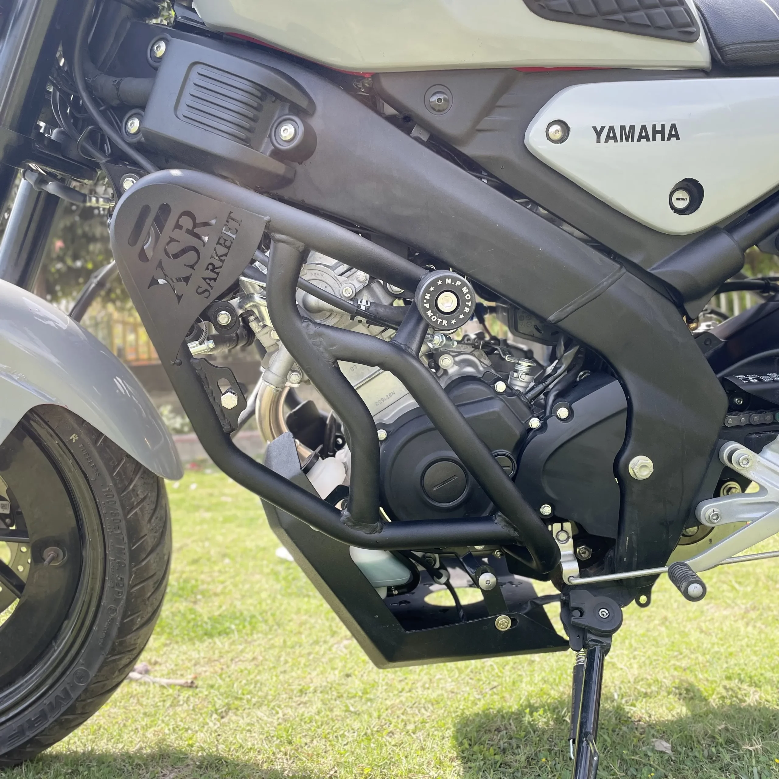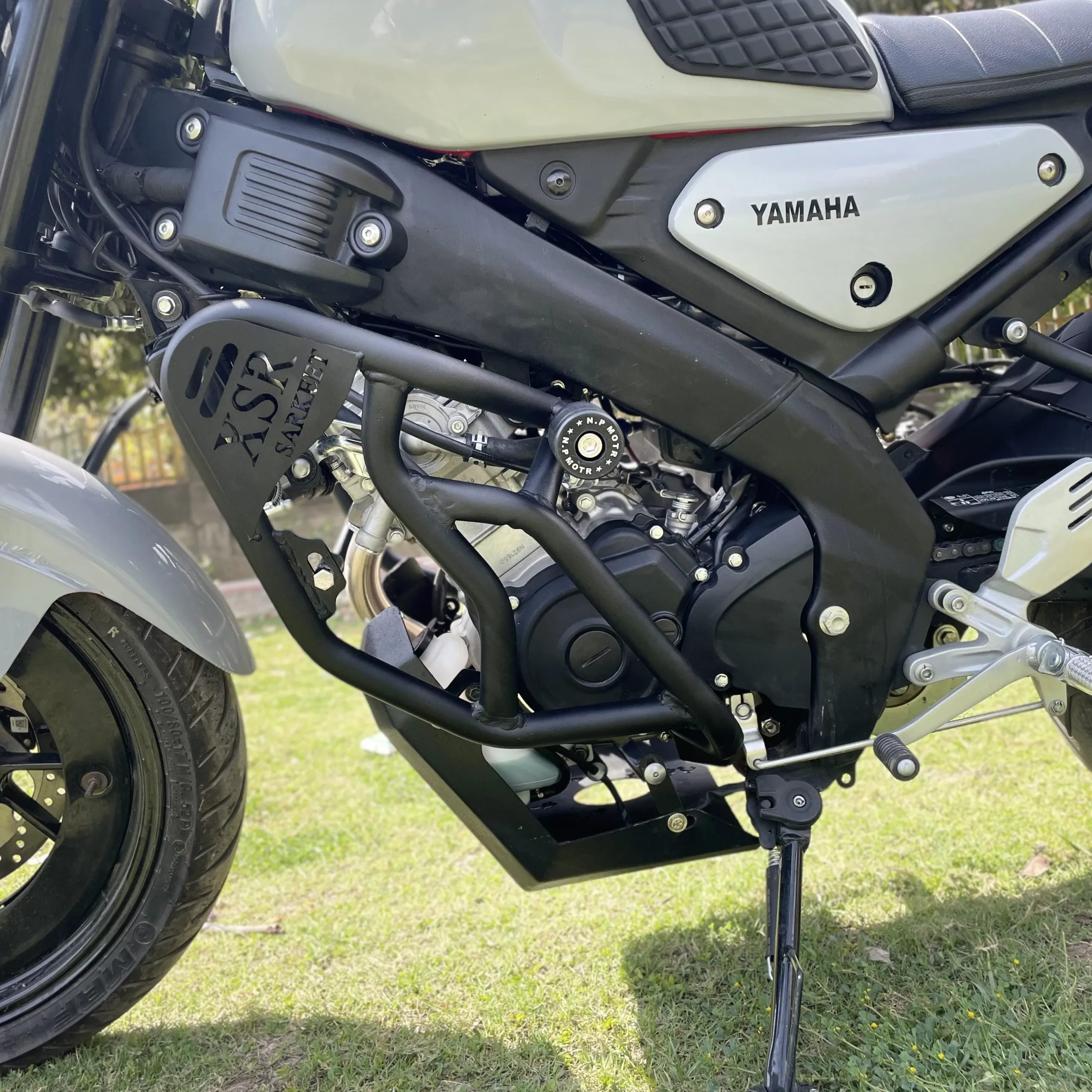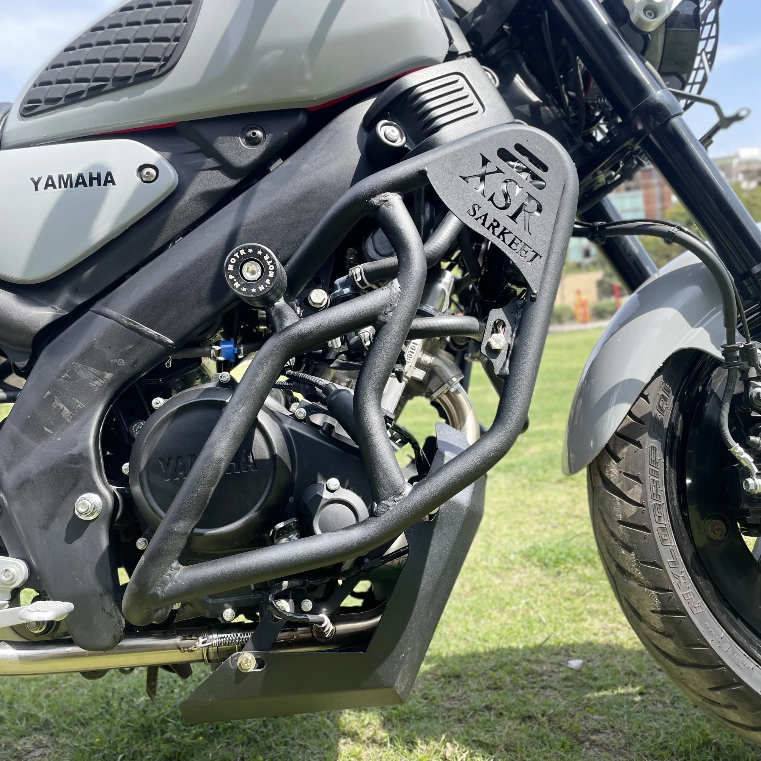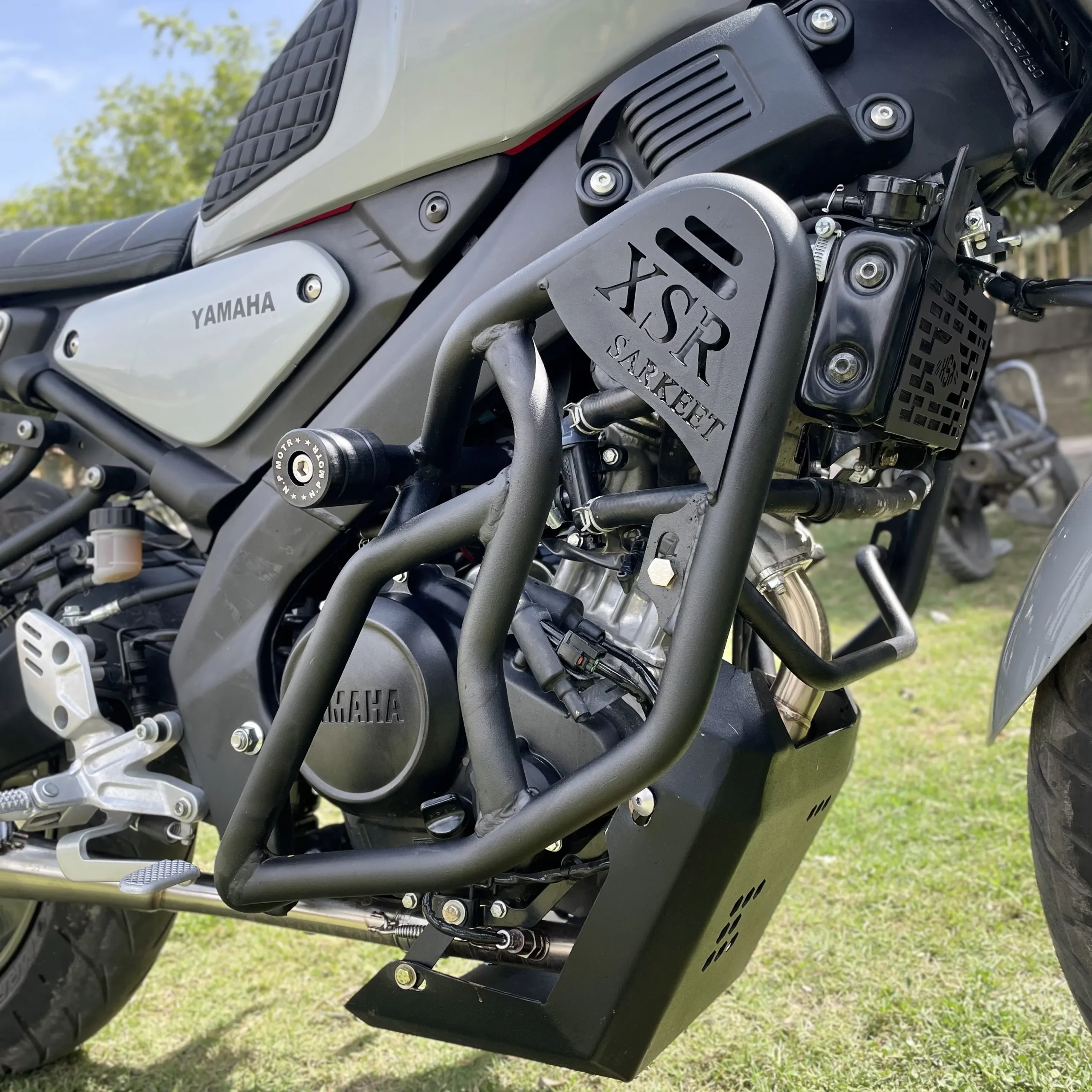 Sarkkart XSR155 C heavy crash guard designed to protect the engine and frame of Yamaha XSR 155 with strong metal construction and secure fit.