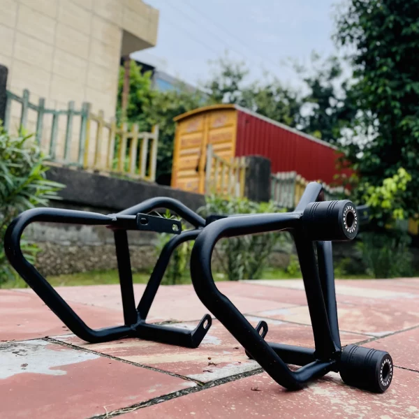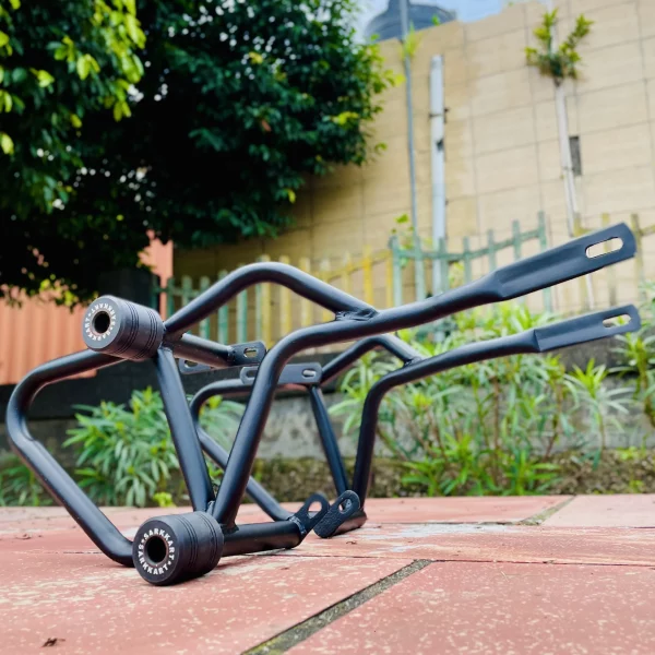 Designed to be rust-free, the crash guard maintains its pristine condition over time, even in harsh weather conditions. The inclusion of four solid sliders offers comprehensive protection by absorbing shock and minimizing damage to the engine, frame, and other vital components during a fall or collision. The sleek black finish enhances the overall look of your Bajaj Pulsar NS400 while providing a robust layer of defense against corrosion.