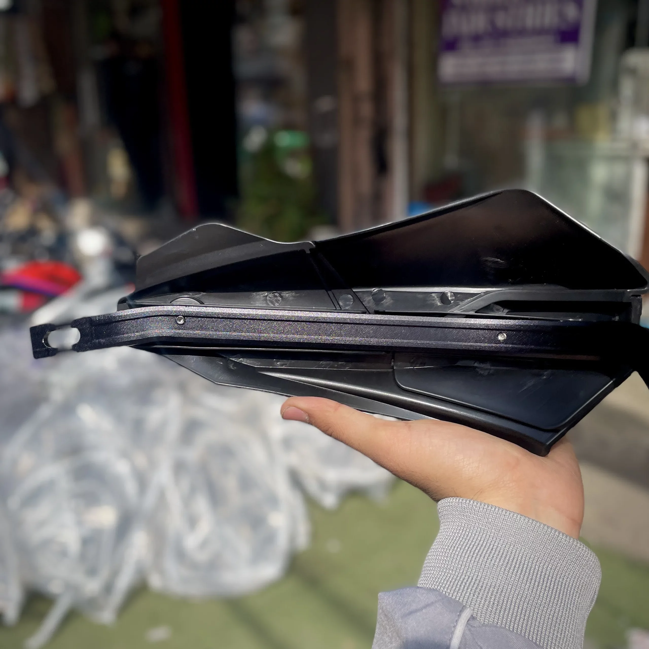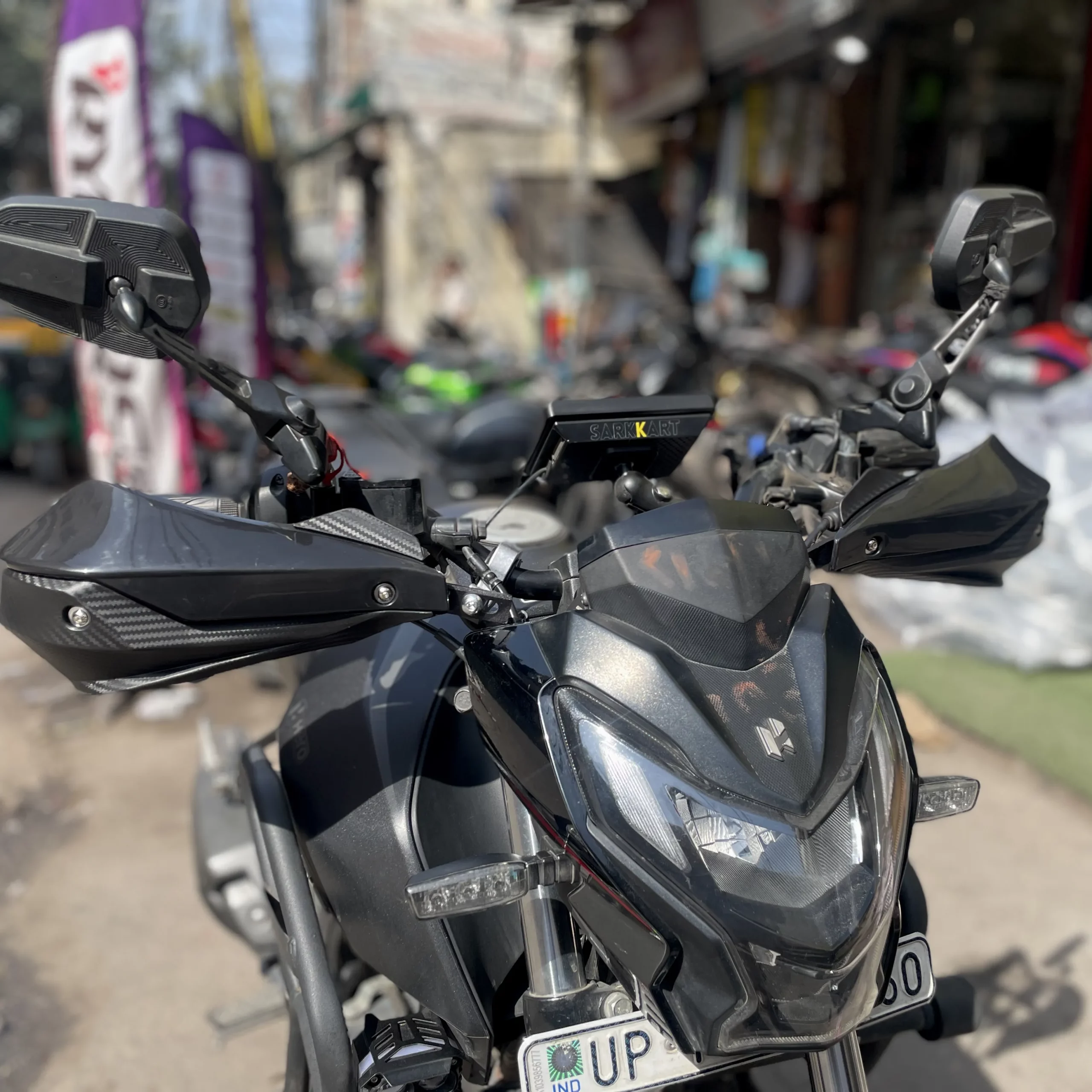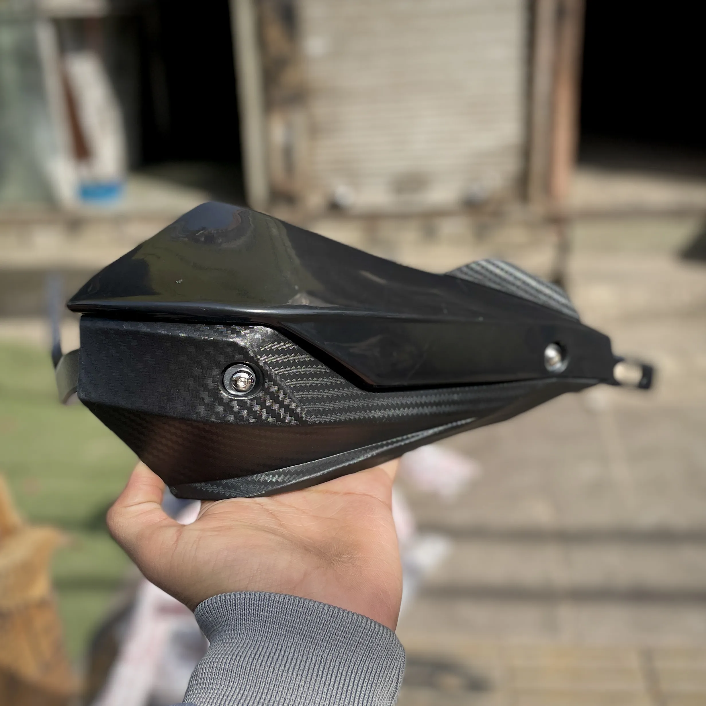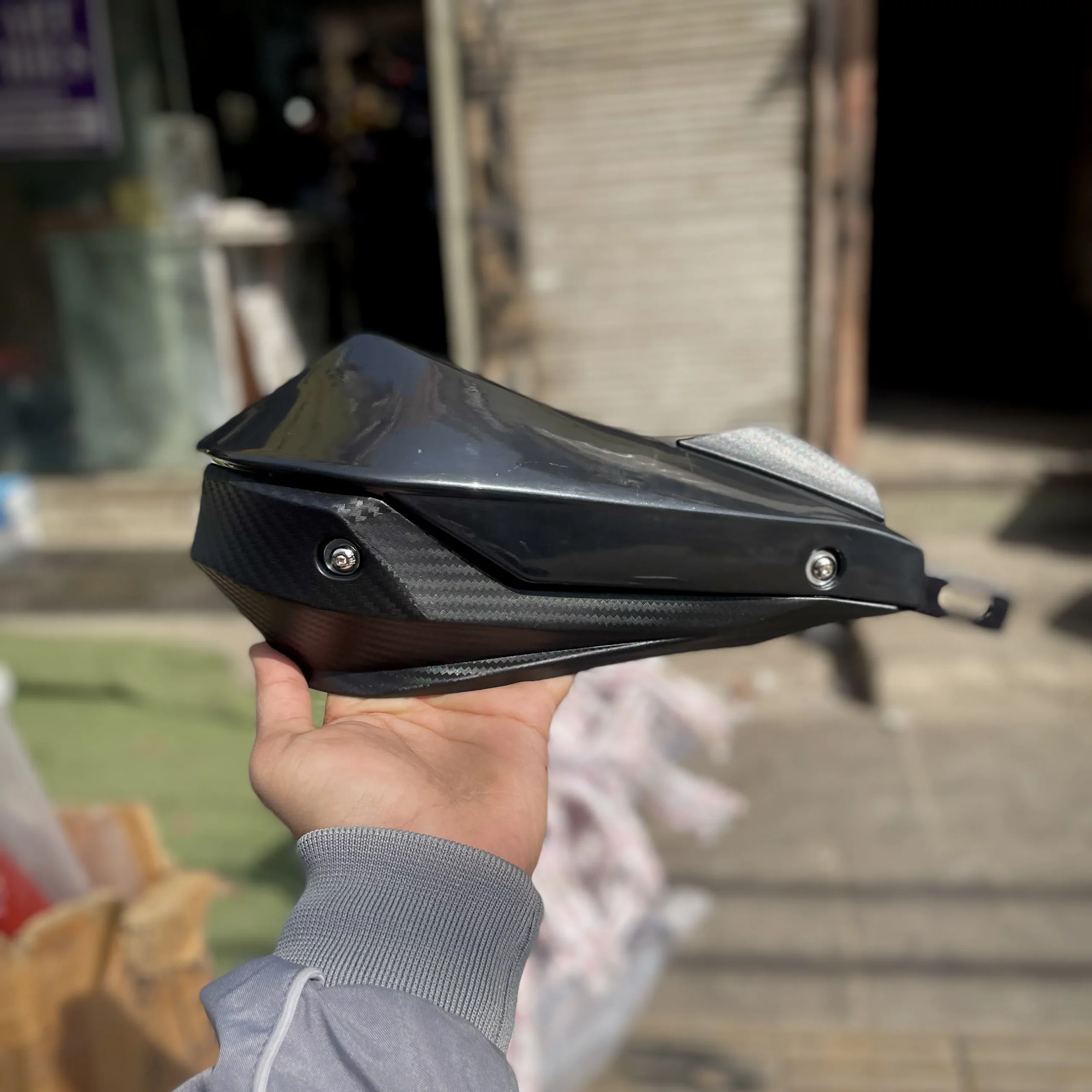 Sarkkart carbon coated handguard kit for motorcycle with height extension to protect hands and levers while adding a premium carbon-style finish.