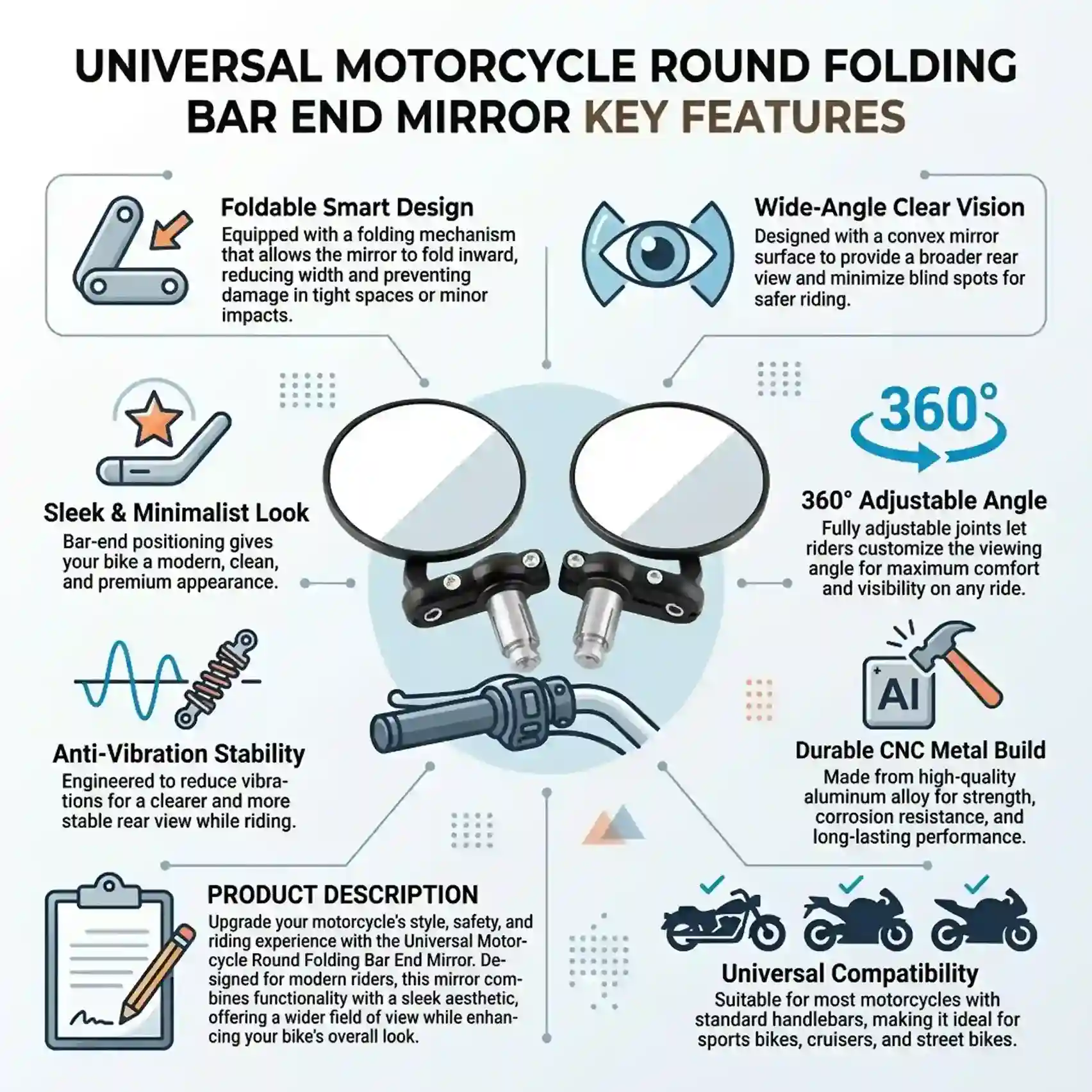 Crafted using CNC-machined aluminium alloy, these mirrors offer strong durability, lightweight design, and a premium finish for long-lasting use.
