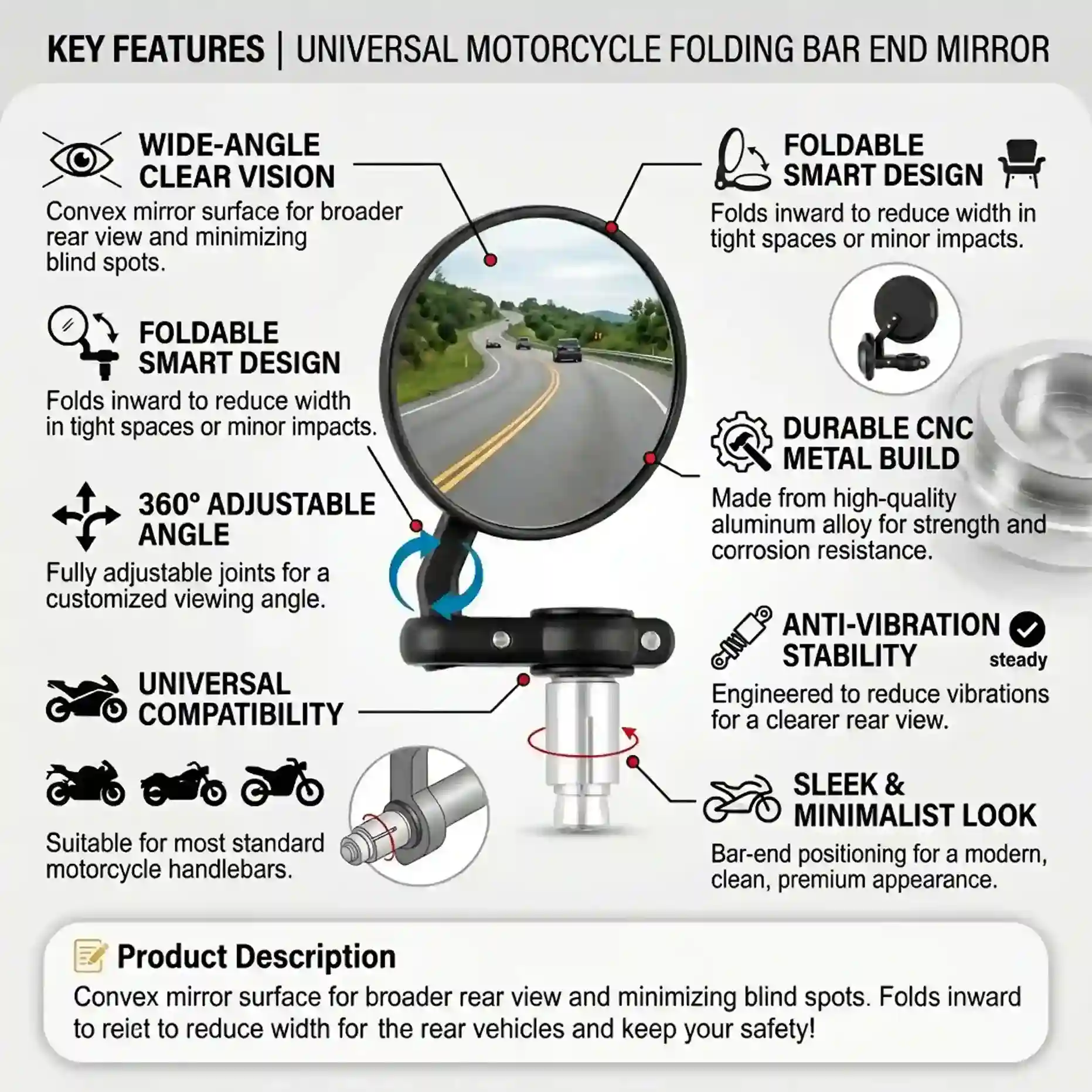 Convex mirror design provides a wider rear view, helping riders stay aware of surrounding traffic for safer lane changes and highway riding.