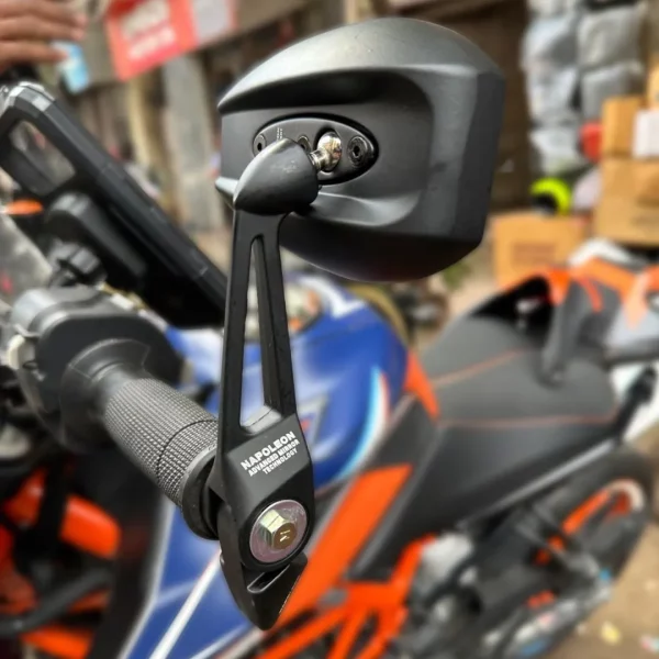 Upgrade your motorcycle’s style and rear visibility with the Napoleon CNC Metal Bar End Mirrors, a premium mirror set designed for riders who want both performance and aggressive aesthetics. Mounted directly at the handlebar ends, these mirrors offer a wider viewing angle and reduced vibration compared to traditional mirrors. Manufactured using precision CNC-machined metal, the mirrors provide excellent durability, strength, and long-term reliability. The solid metal construction helps minimize vibration, ensuring a clear and stable rear view even at high speeds or on rough roads. The mirrors feature anti-glare glass, which reduces headlight reflections during night riding and enhances visual clarity. This improves rider safety by providing a comfortable and distortion-free rear view. Designed with universal compatibility, the Napoleon bar end mirror set fits most motorcycles equipped with standard handlebars. The secure mounting mechanism ensures stable installation while maintaining a clean and sporty handlebar look. Perfect for sports bikes, naked bikes, café racers, cruisers, and custom motorcycles, these mirrors deliver an ideal combination of style, functionality, and durability. Key Features & Benefits Type: Bar End Rear View Mirror Set Material: CNC-machined premium metal construction Mirror Glass: Anti-glare wide-angle lens Mount Type: Handlebar end / bar end installation Performance: Reduced vibration & stable visibility Fitment: Universal for most motorcycles Design: Sporty, aggressive & modern styling Installation: Easy and secure mounting