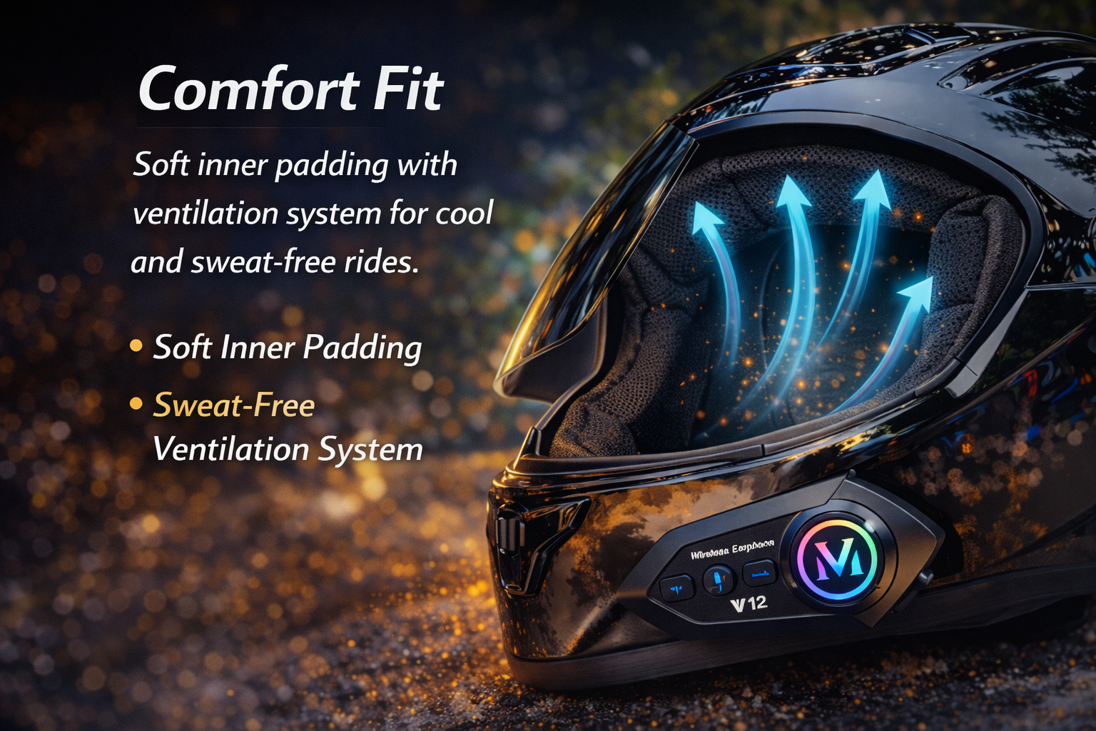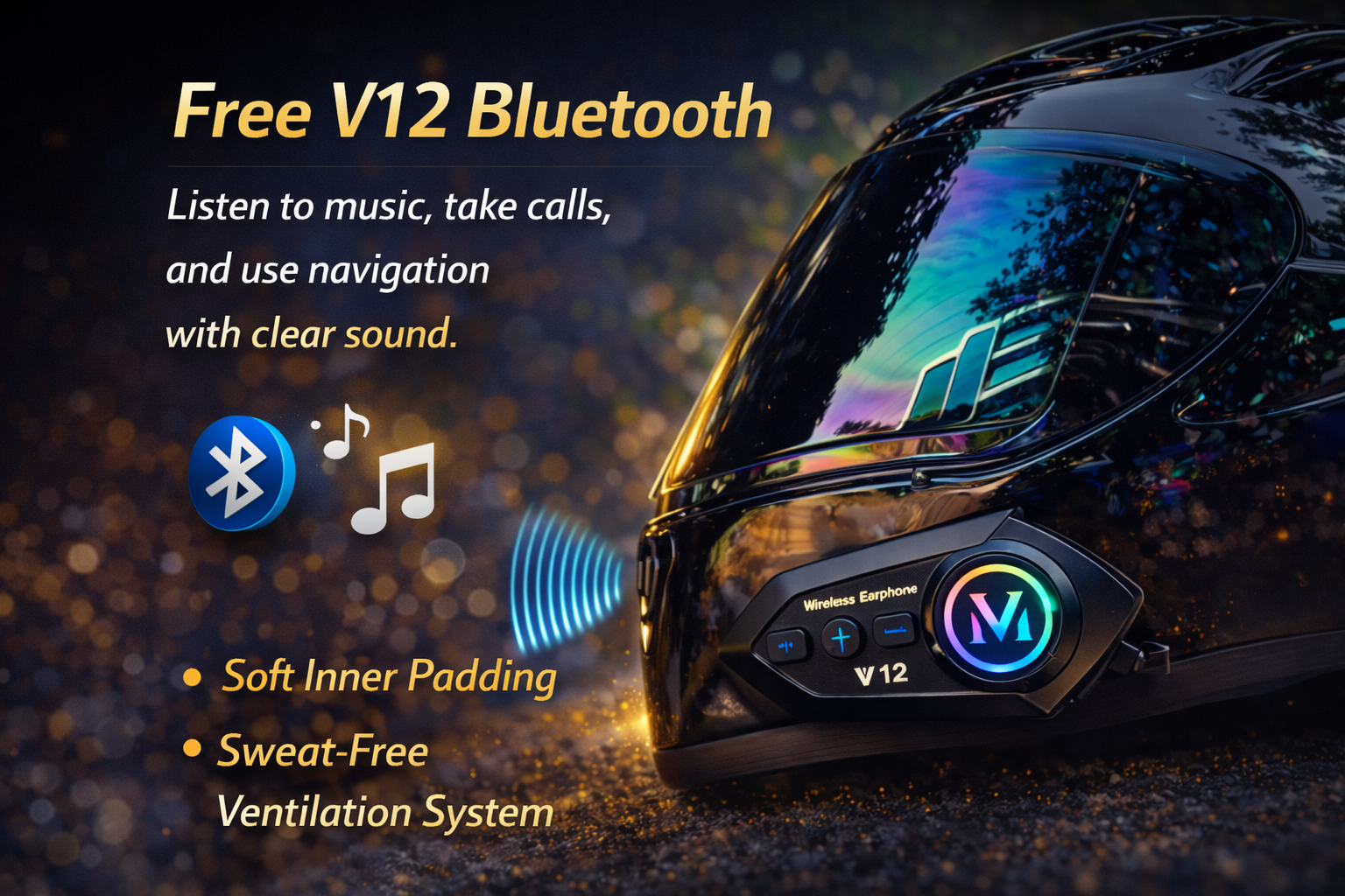 The helmet comes with a free V12 Bluetooth device that allows you to attend calls, listen to music, and follow navigation while riding.
