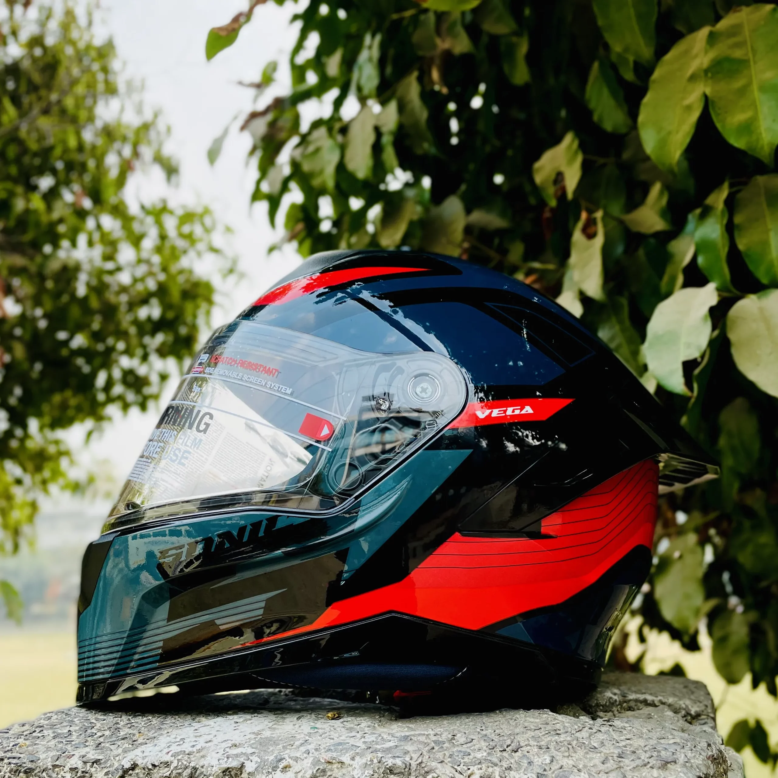 Vega Sonic Trigger full face helmet in black red color with clear visor, spoiler, and ISI certification for safe riding.