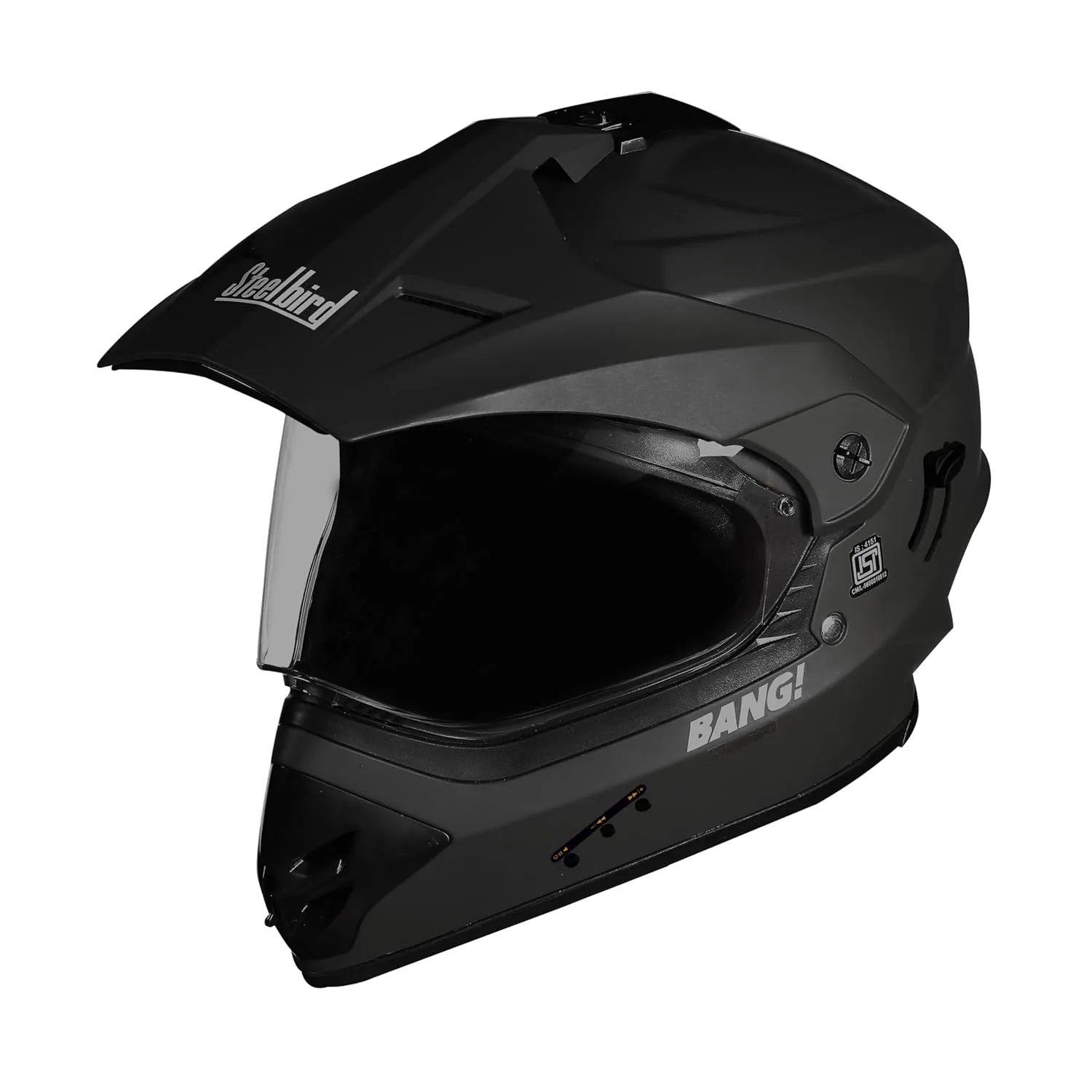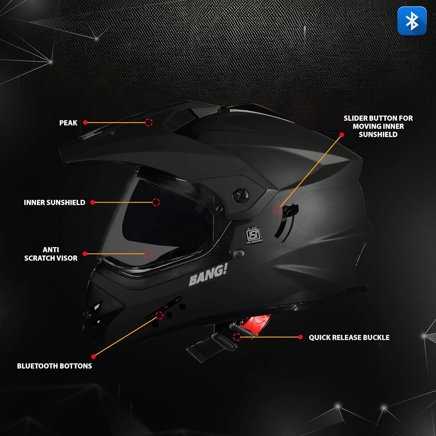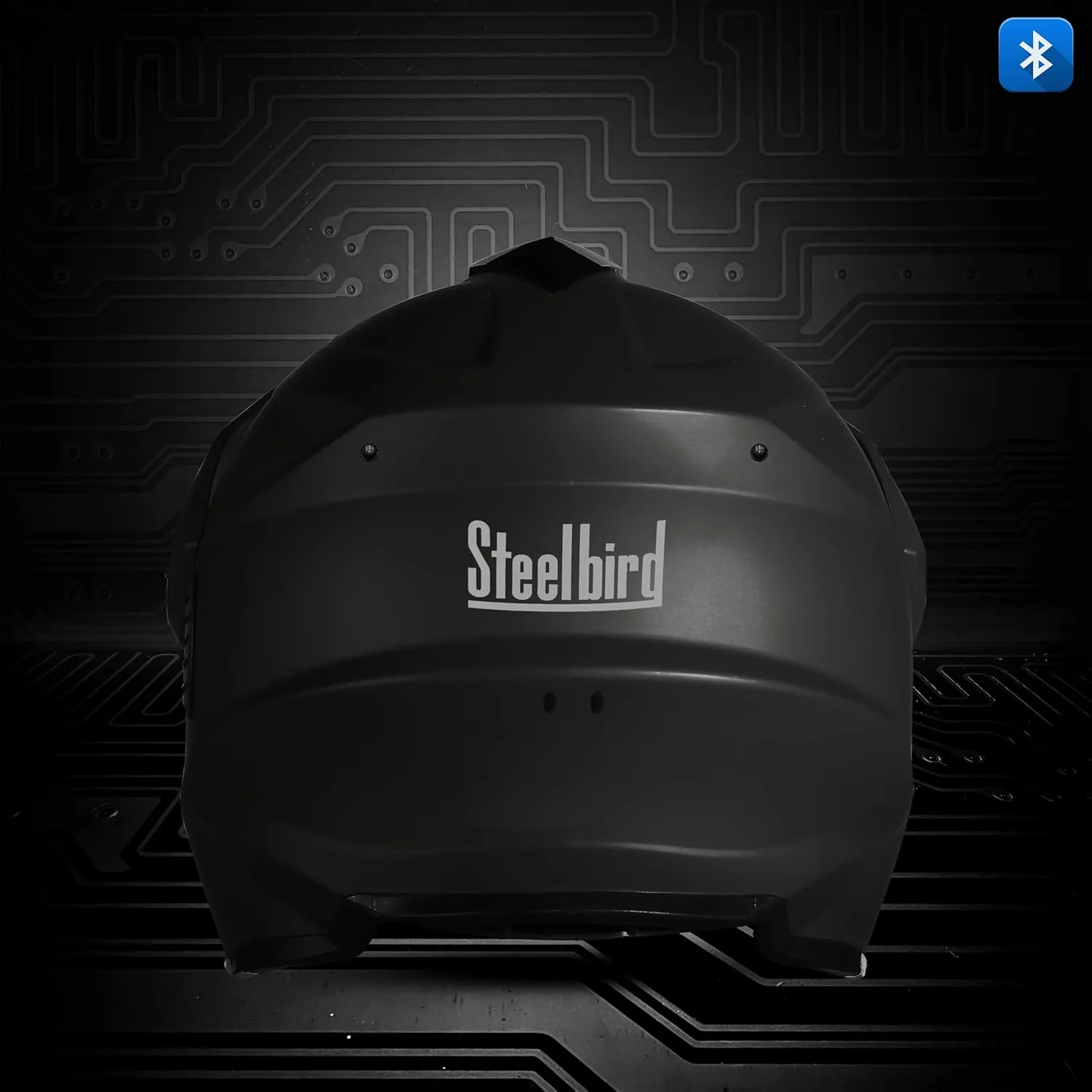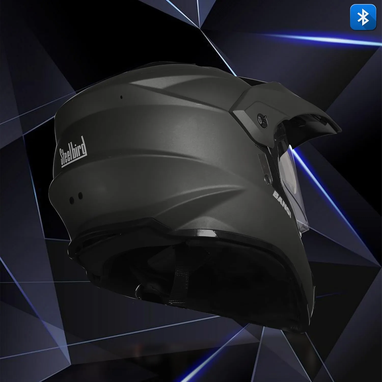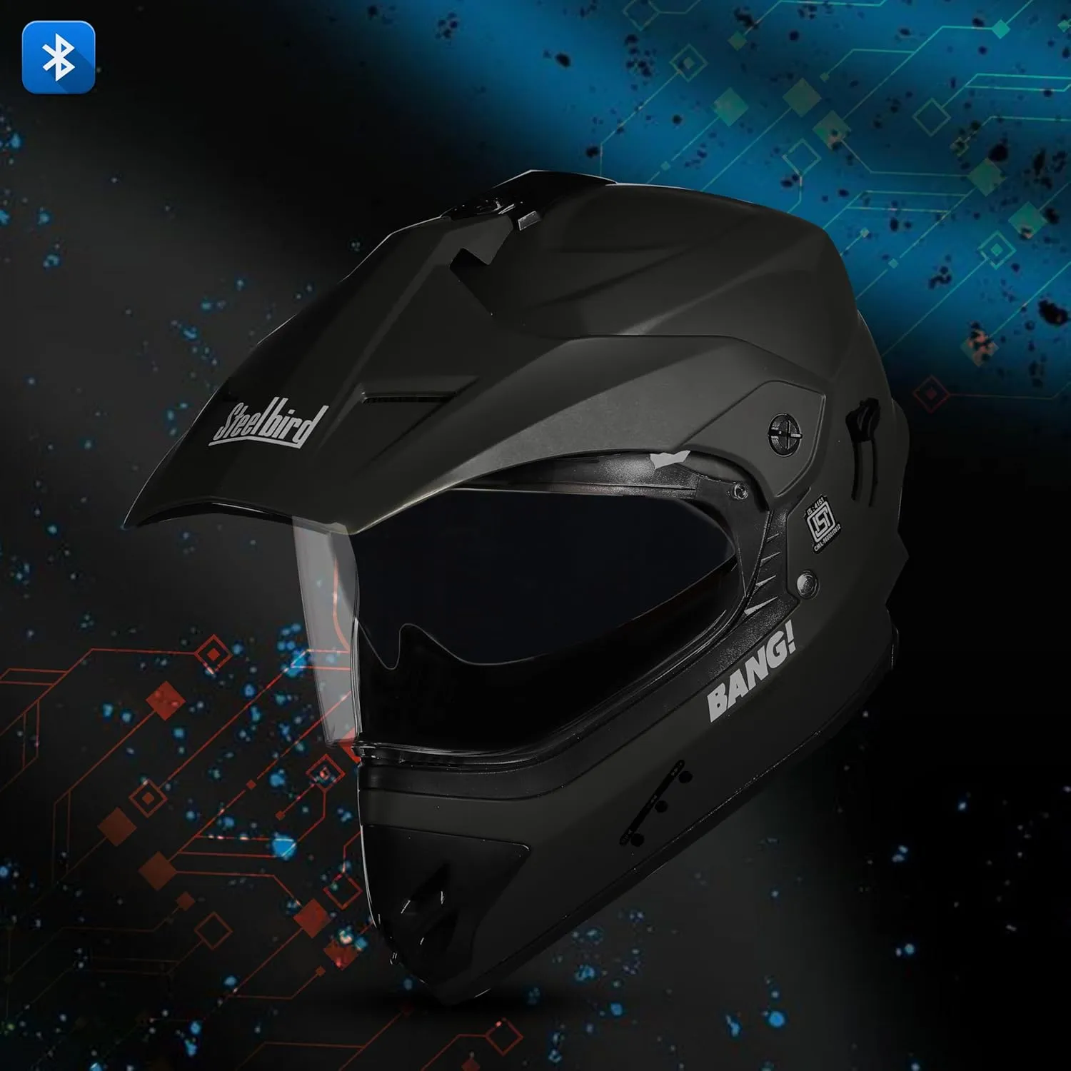 Steelbird Bluetooth certified motocross helmet with inner sunshield, durable shell construction, and integrated wireless connectivity.