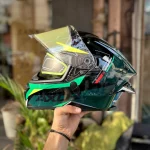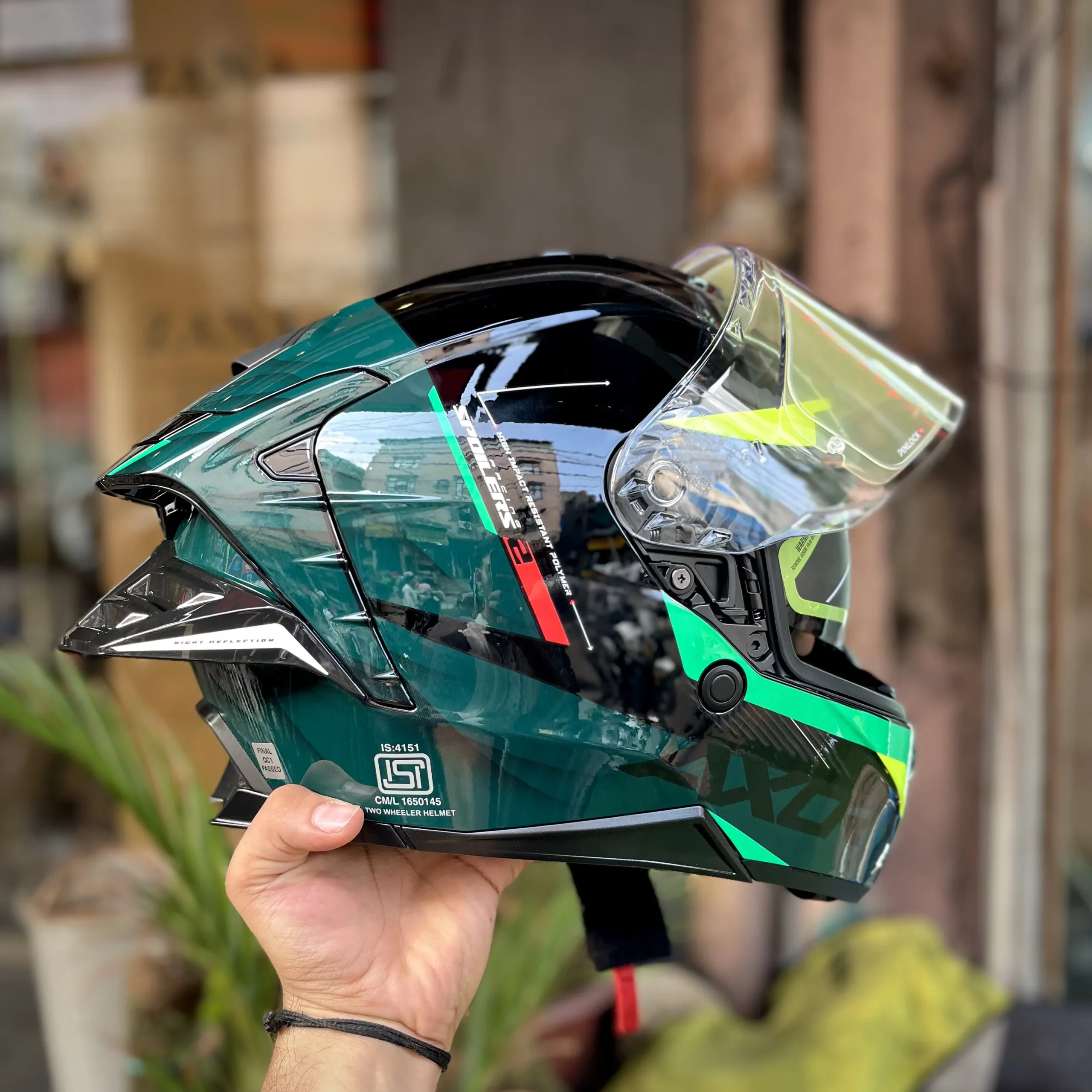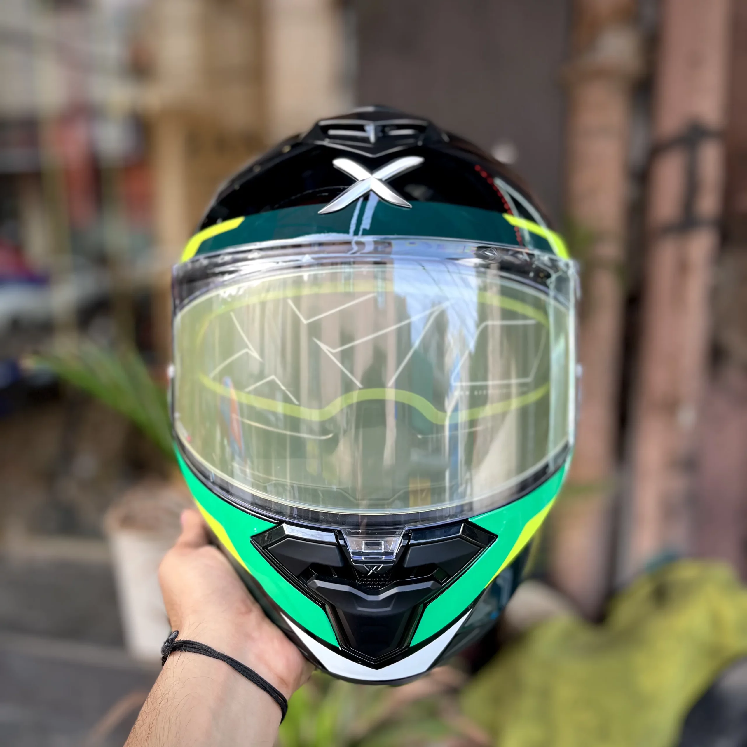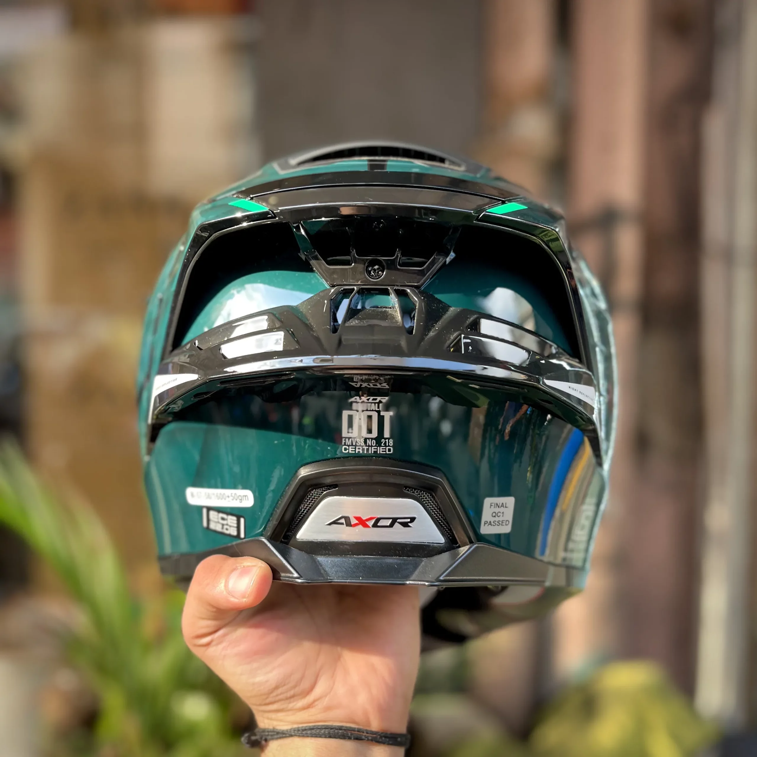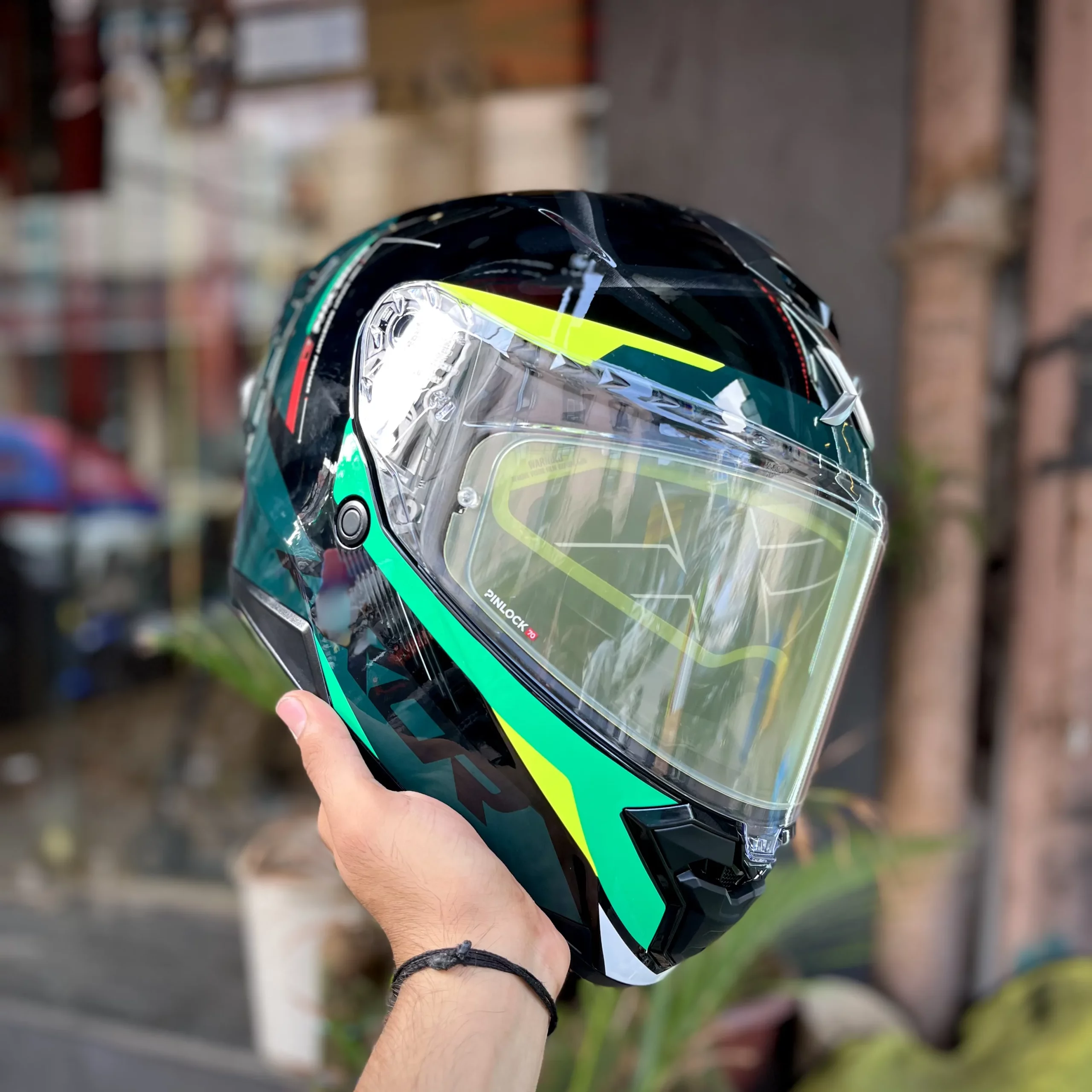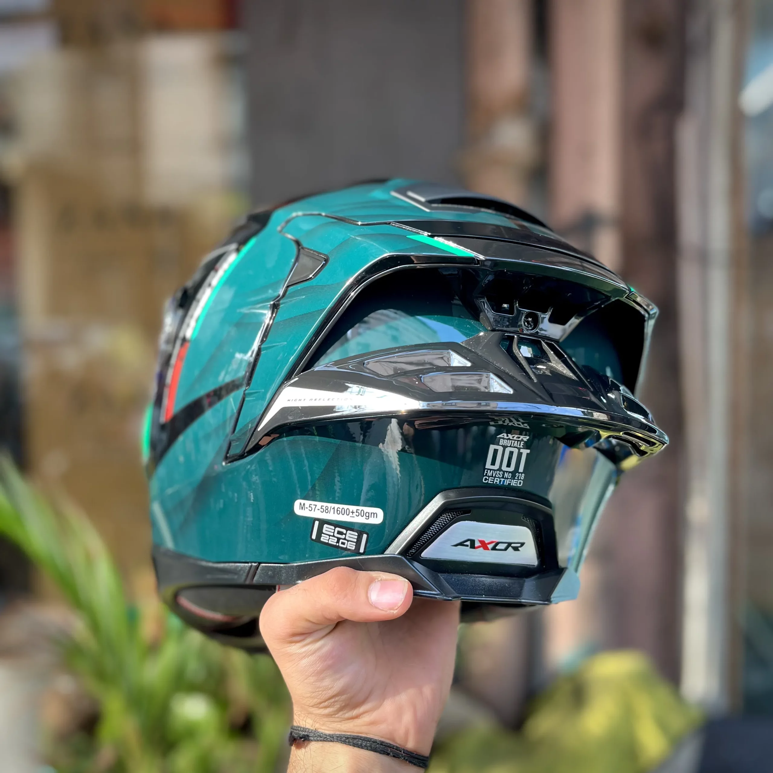 Experience ultimate protection and bold style with the Axor Brutale Krytic dual spoiler helmet in striking black and green. This ISI, DOT, and ECE R-22.06 certified helmet combines advanced polycarbonate shell technology with aggressive dual spoiler aerodynamics for stability at high speeds. Whether you ride daily commutes or hit the track, this helmet delivers next-level safety with an eye-catching look that stands out on any ride.