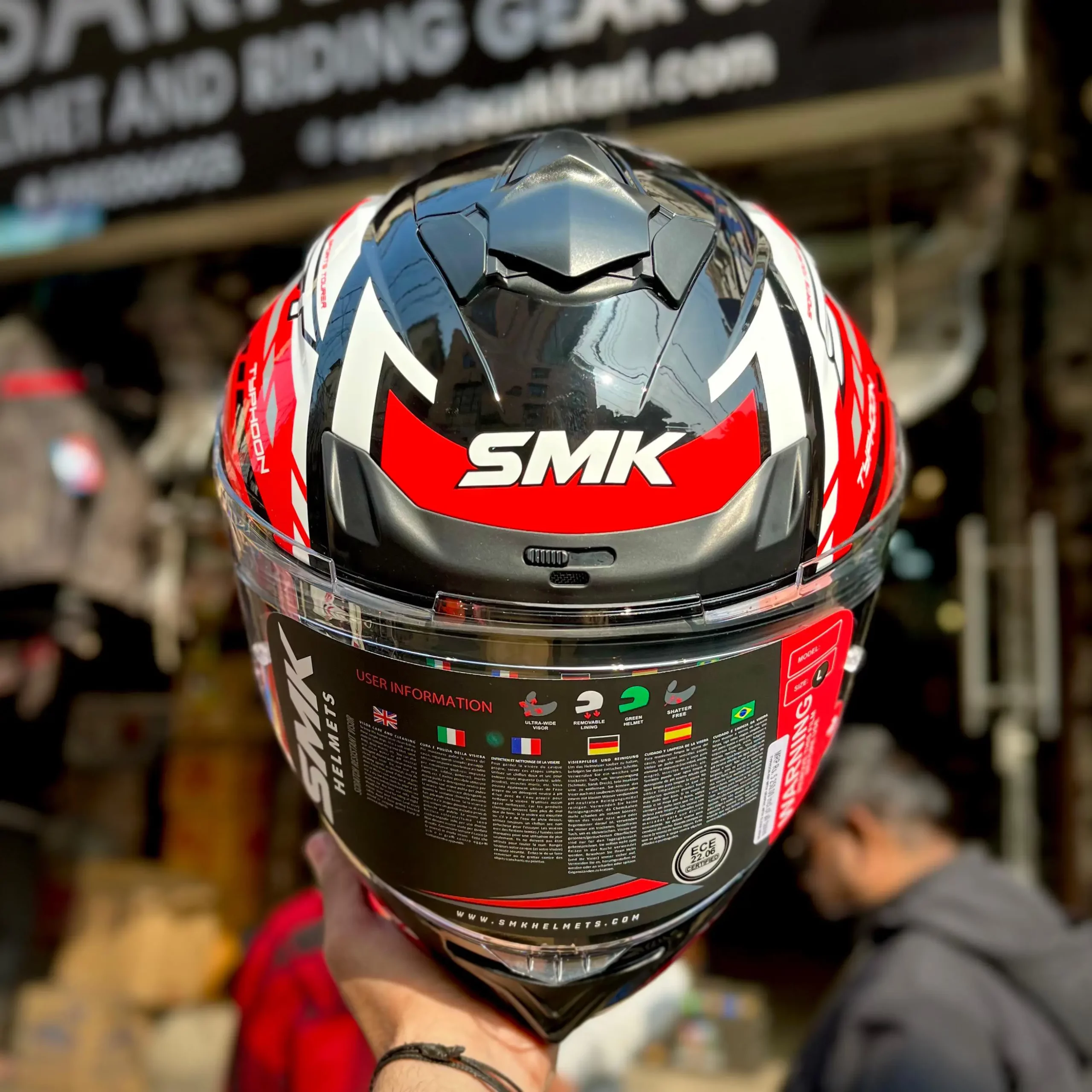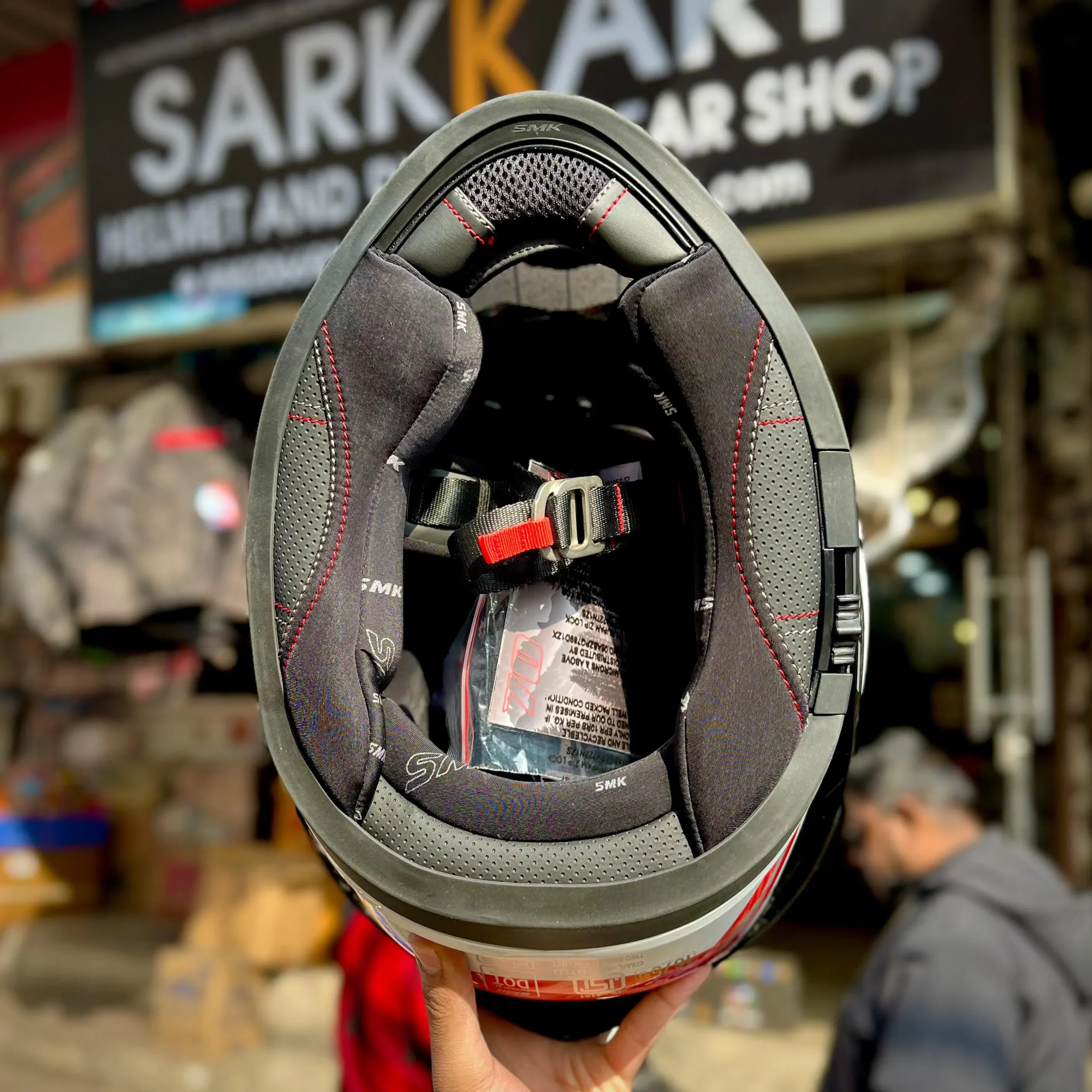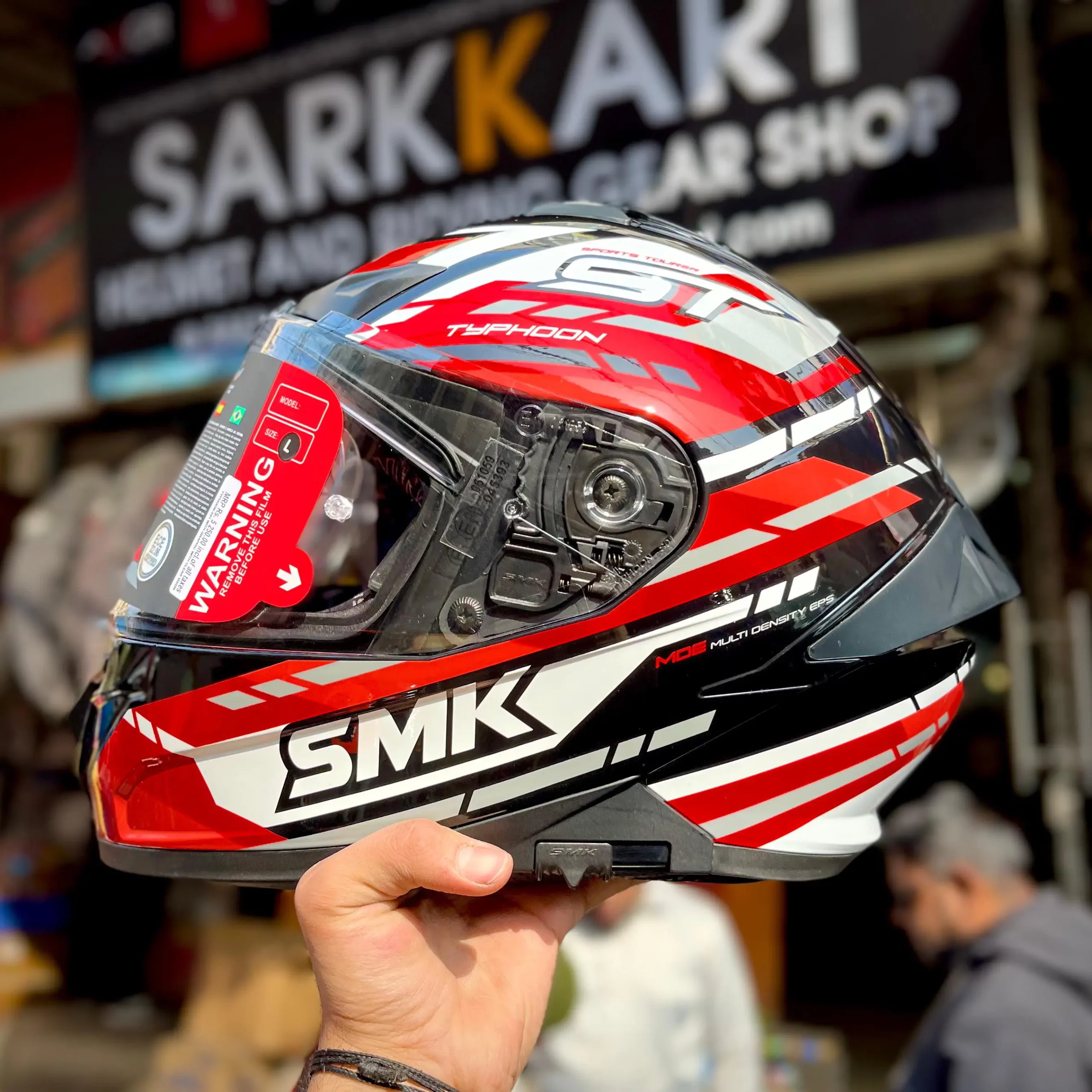 Experience unmatched style with the SMK Typhoon Sports Tourer GL231, showcasing a bold glossy black finish with striking red-white decor. This helmet perfectly balances aesthetics and functionality, making it a must-have for modern riders.
