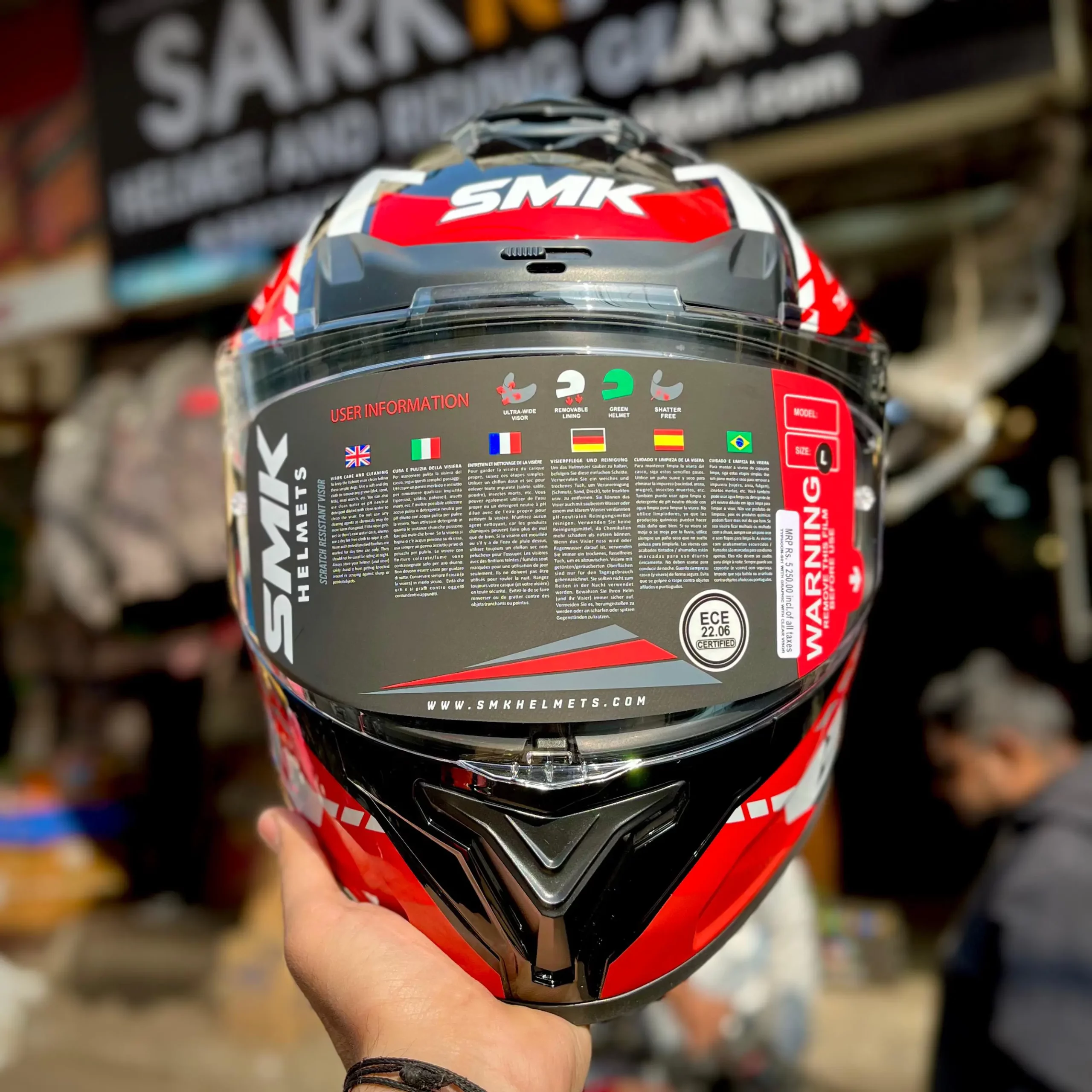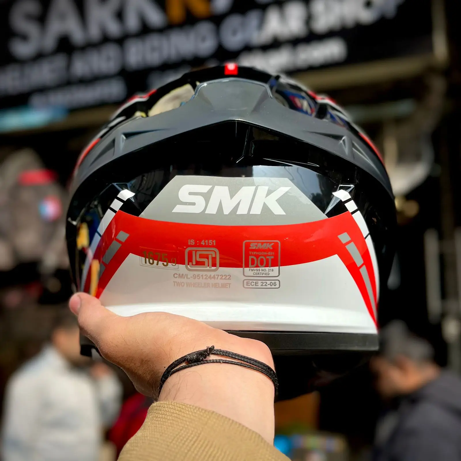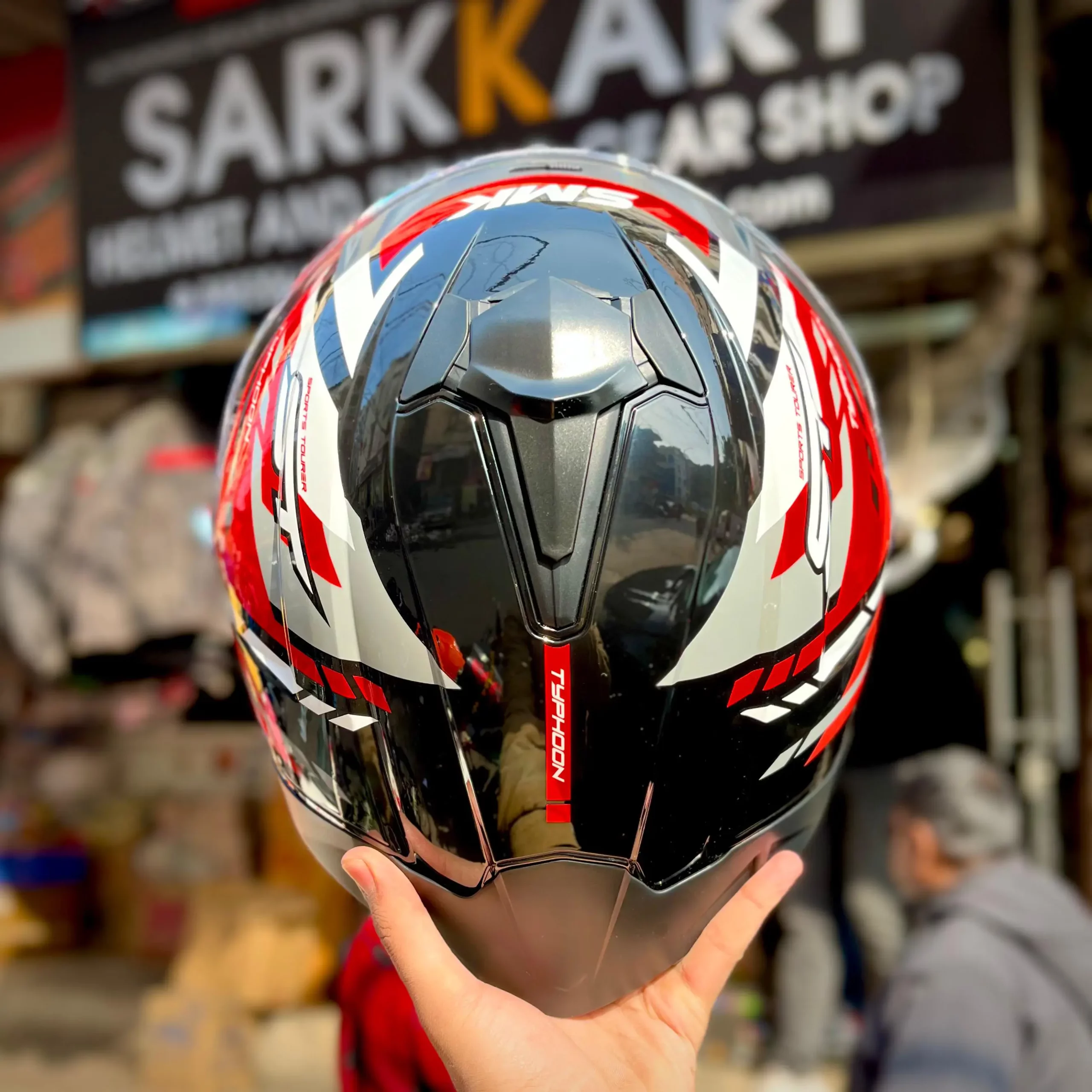 Experience unmatched style with the SMK Typhoon Sports Tourer GL231, showcasing a bold glossy black finish with striking red-white decor. This helmet perfectly balances aesthetics and functionality, making it a must-have for modern riders.