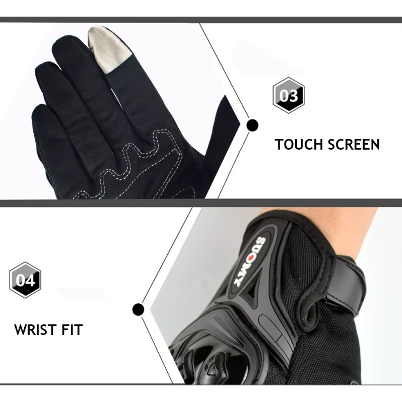 Experience top level riding protection and all day comfort with the Suomy SU10 Full Finger Motorcycle Gloves, engineered for riders who want maximum safety, strong grip control, and high performance ventilation. These gloves combine hard knuckle protective armor, breathable mesh construction, and touchscreen compatible fingertips to deliver unmatched durability for daily riding, highway touring, racing, and outdoor sports.