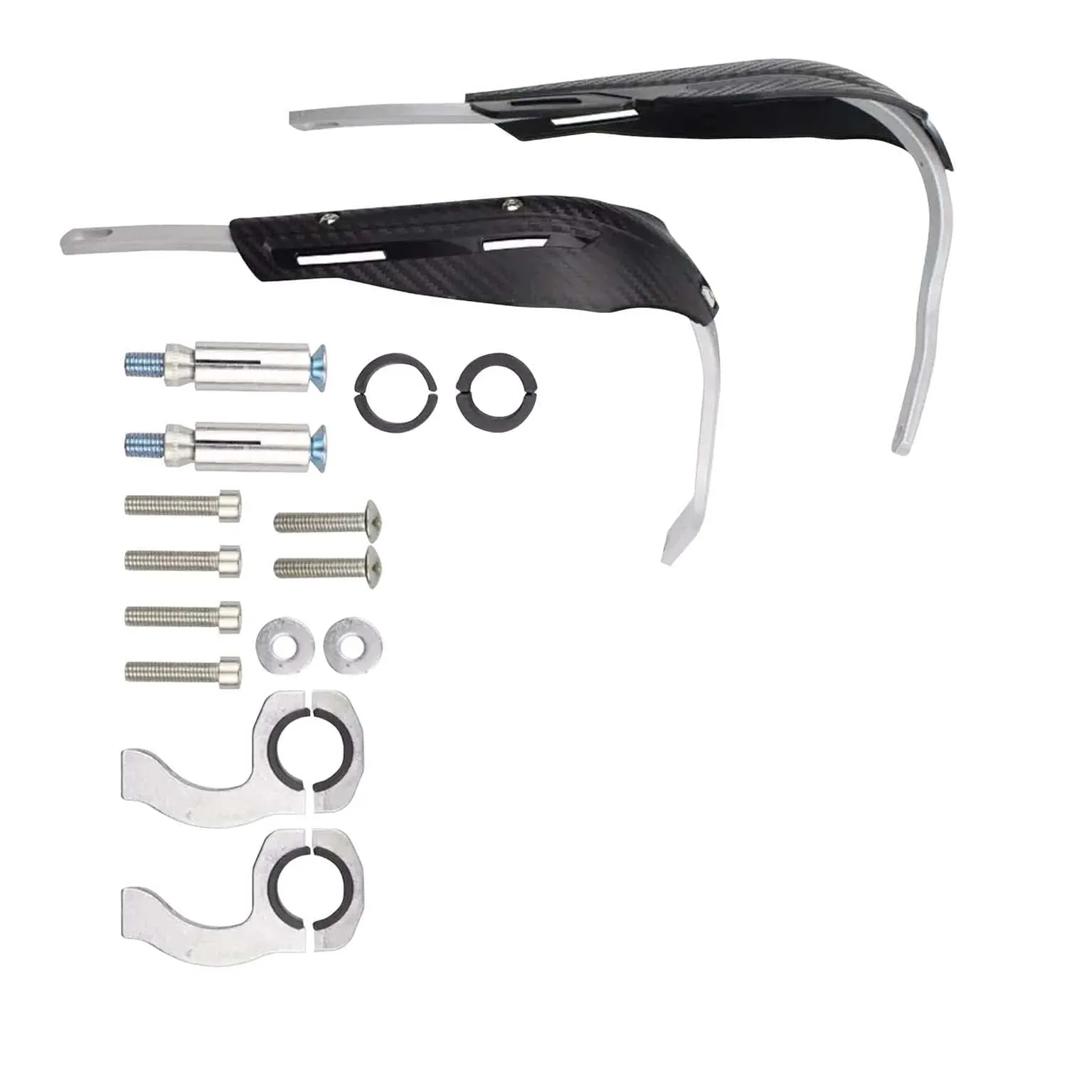 Durable plastic and aluminum hand guard for bikes. Universal fit, excellent hand protection from wind, debris, and minor impacts.