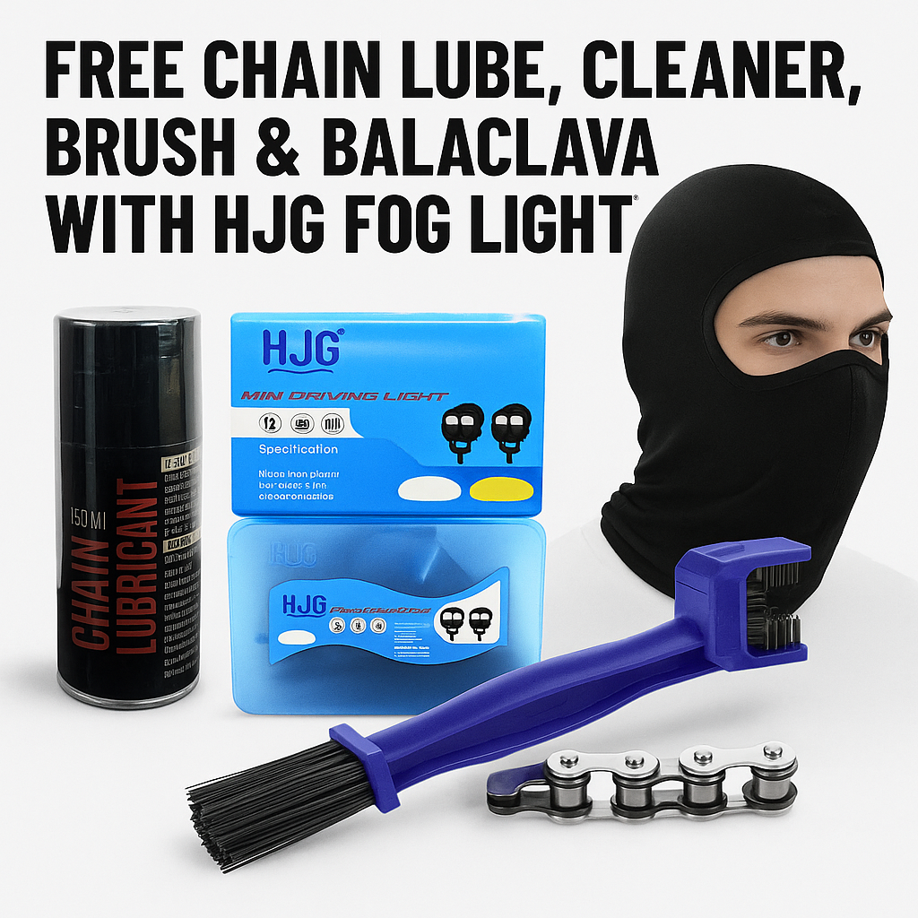 Ride Brighter, Maintain Better – Free Chain Lube, Cleaner, Brush & Balaclava with HJG Fog Light!